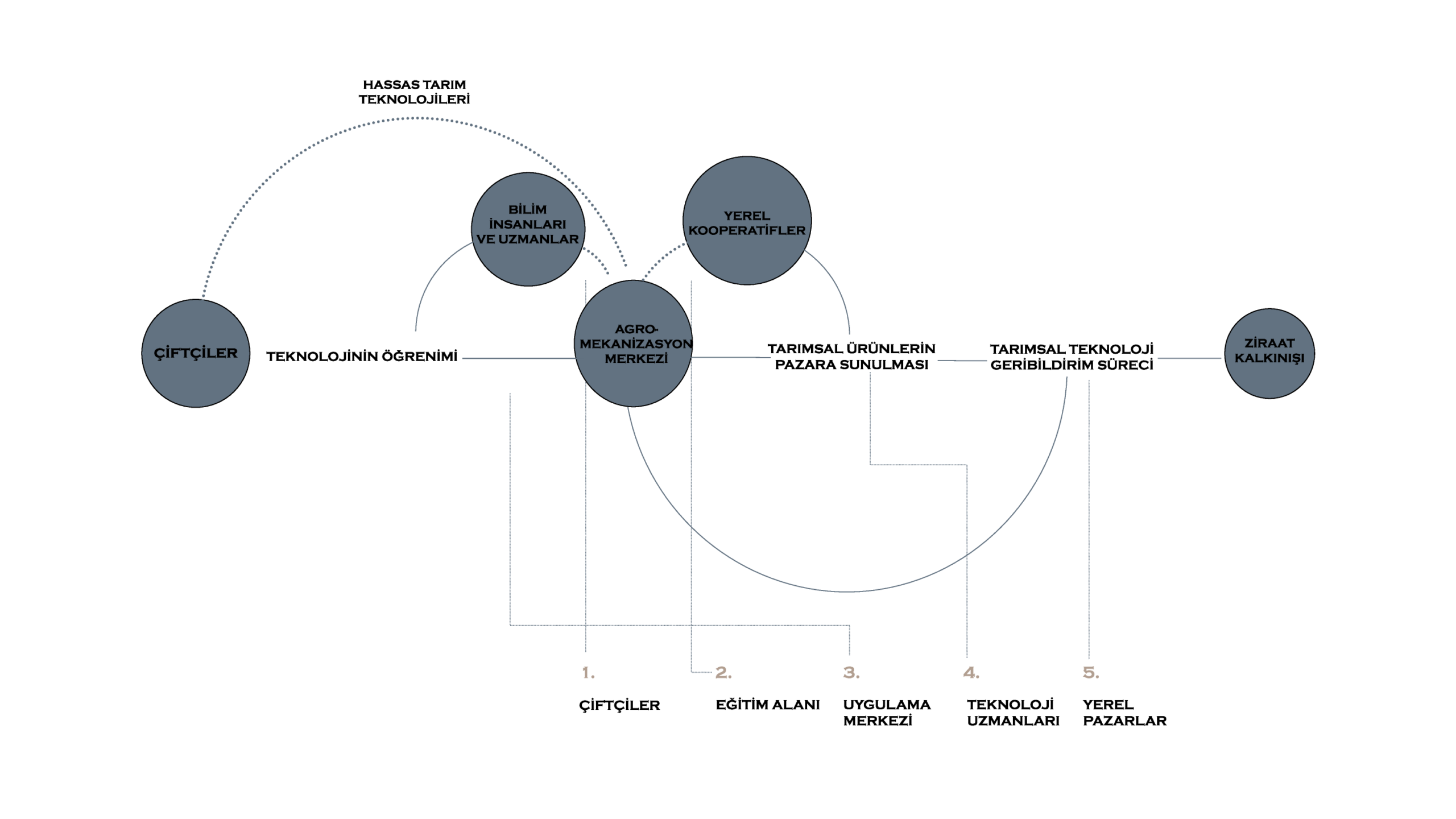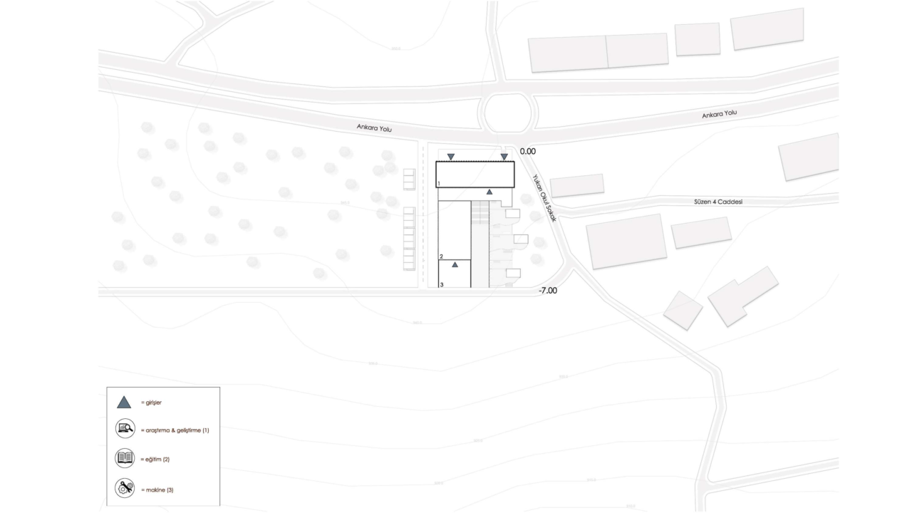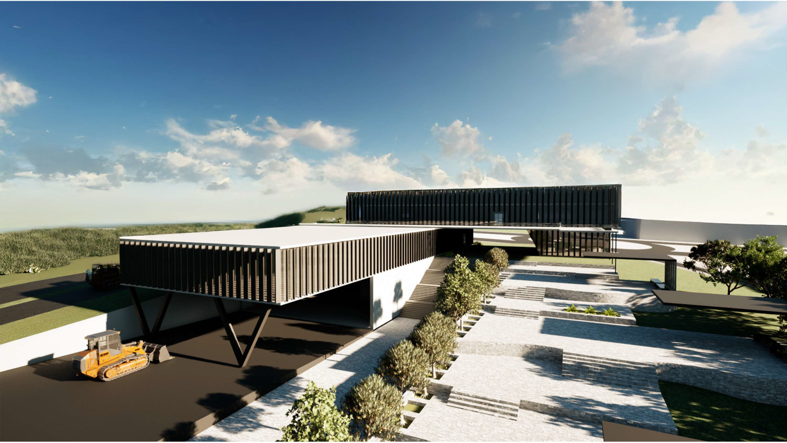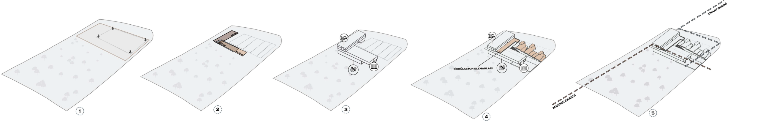 The project starts with a simple linear organization of the program on the site. This structure is then shaped around a central courtyard, which becomes the main gathering and interaction space. Circulation and functional units are added step by step, making the system clear and easy to read. In the final stage, the relationship between the mechanization axis and the landscape defines the overall form of the project.