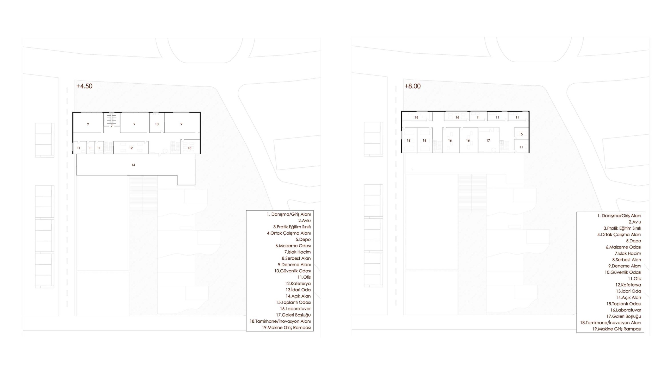 The layout is organized around a central courtyard that acts as the focal point, enhancing both social interaction and spatial continuity. Surrounding structures are arranged to ensure clear circulation, accessibility, and functional efficiency. Research areas include laboratories for advancing agricultural technologies, while educational spaces are designed flexibly to accommodate different learning scenarios. Mechanization units consist of large-scale workshops and areas for equipment maintenance and production.