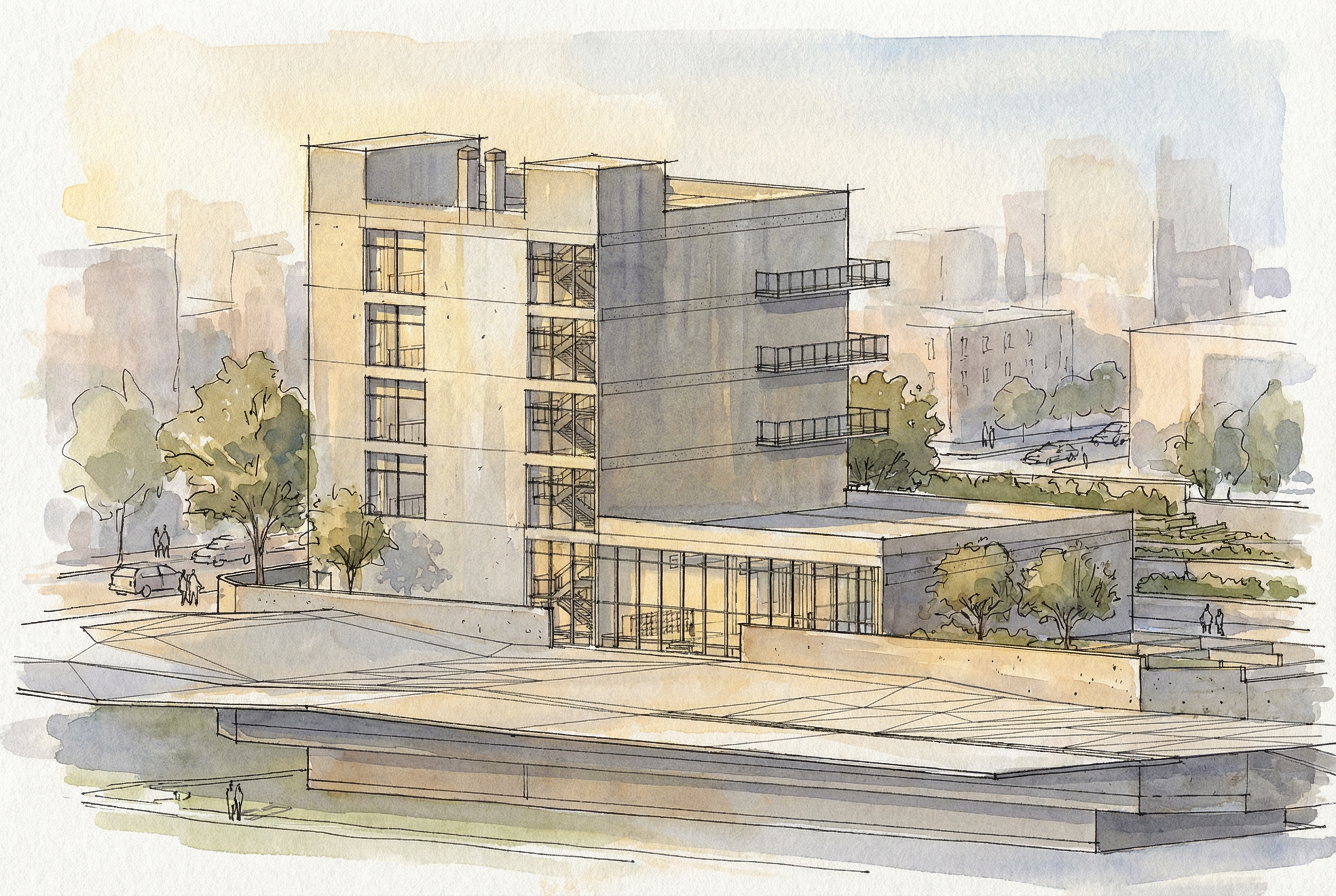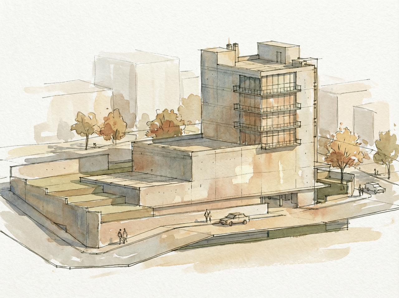 Located on a sloped site, the design is shaped by the existing topography, creating stepped platforms that strengthen the relationship between the building and the landscape. This approach allows for multiple access points and enhances both circulation and spatial experience. The massing is carefully organized to ensure clarity in movement, efficient use of space, and maximum exposure to natural light.